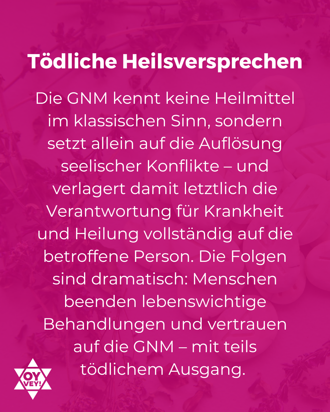 Die GNM nach Hamer kennt und duldet keine Heilmittel im klassischen Sinn, sondern setzt allein auf die Auflösung seelischer Konflikte. Damit verlagert sie letztlich die Verantwortung für Krankheit und Heilung vollständig auf die betroffene Person. Wer krank ist, muss an sich und seinen Konflikten arbeiten, trägt selbst eine gewisse Mitschuld am eigenen Leid und die alleinige Verantwortung für die Heilung. Da externe Auslöser wie Viren nicht anerkannt werden, duldet die GNM auch keine „klassische“ medizinische Behandlung etwas durch Medikamente. Was bei einer einfachen Erkältung noch ohne größere Folgen bleiben kann, wird bei schwereren Erkrankungen schnell zur Gefahr. Die Folgen können dramatisch sein, wenn Menschen bspw. von lebensrettenden Behandlungen wie einer Chemotherapie bei Krebserkrankungen absehen. Dass dieser Extremfall bei Anhänger*innen der GNM leider tatsächlich eintritt, hat der Podcast „Seelenfänger“ eindrücklich dokumentiert.