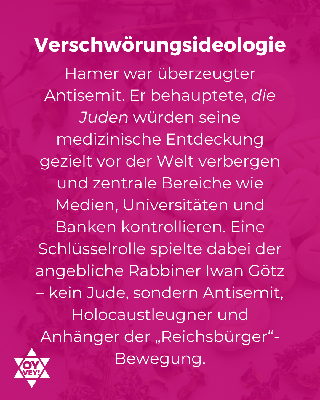 Dass die GNM keine harmlose Alternativmedizin ist, ist mittlerweile klar. Aber sie ist auch ein geschlossenes Weltbild. Im Zentrum steht eine antisemitische Verschwörungserzählung: Hamer behauptete, eine jüdische Weltelite kontrolliere das Gesundheitssystem, um Menschen krank zu machen. Dieser Mythos einer angeblichen Elite, die in solchen Erzählungen eigentlich immer als jüdisch definiert wird, ist ein Klassiker der antisemitischen Verschwörungstheorien und findet sich in zahlreichen Erzählungen auf unterschiedliche Art und Weise wieder. Und so lässt sich festhalten, dass Hamer ein überzeugter Antisemit war. Er behauptete, „die Juden“ würden eine geheime Medizin vor der Welt verbergen, mit der sie sich selbst ein langes gesundes Leben sichern würden. Den Rest der Welt würden sie mit der von ihm wie vielen anderen Verschwörungsgläubigen abfällig als Schulmedizin bezeichneten modernen, evidenzbasierten Medizin, abspeisen. Diese würde nicht heilen, sondern im Gegenteil krankmachen. Außerdem würden „die Juden“ neben dem Gesundheitssystem auch die Medien, Banken und Wissenschaften kontrollieren und so ihre angebliche Medizin geheim halten. Hamer behauptete selbst diese Medizin entdeckt zu haben und nun zugänglich zu machen, deshalb werde er von etablierten Ärzten und dem Gesundheitssystem abgelehnt und verfolgt. Er wurde mehrfach wegen Volksverhetzung und Shoahleugnung verurteilt und verlor seine Approbation aufgrund schwerwiegender Behandlungsfehler.