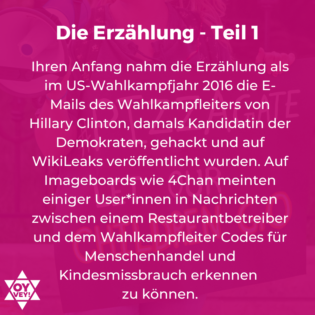 Ihren Ausgangspunkt hat die Erzählung im Jahr 2016. Im US-Wahlkampf traten Hillary Clinton für die Demokraten und Donald Trump für die Republikaner an. Damals wurden die E-Mails des Wahlkampfleiters von Hillary Clinton, John Podesta, gehackt und auf WikiLeaks veröffentlicht. Auf Imageboards wie 4Chan oder 8Chan meinten einiger User*innen in den Nachrichten zwischen Podesta und einem Restaurantbetreiber in Washington D.C. Codes für Menschenhandel und Kindesmissbrauch erkennen zu können.Daraus entwickelte sich die völlig falsche und durch keine Fakten gestützte Behauptung, in der Comet Pizzeria in Washington befände sich der Eingang zu einem unterirdischen Tunnelsystem. Darin würden Hillary Clinton und andere prominente Vertreter*innen der Demokraten Kinder gefangen halten, die sie entweder missbrauchen oder verkaufen würden. Später trat noch die Unterstellung hinzu, sie würden das Blut der Kinder trinken.