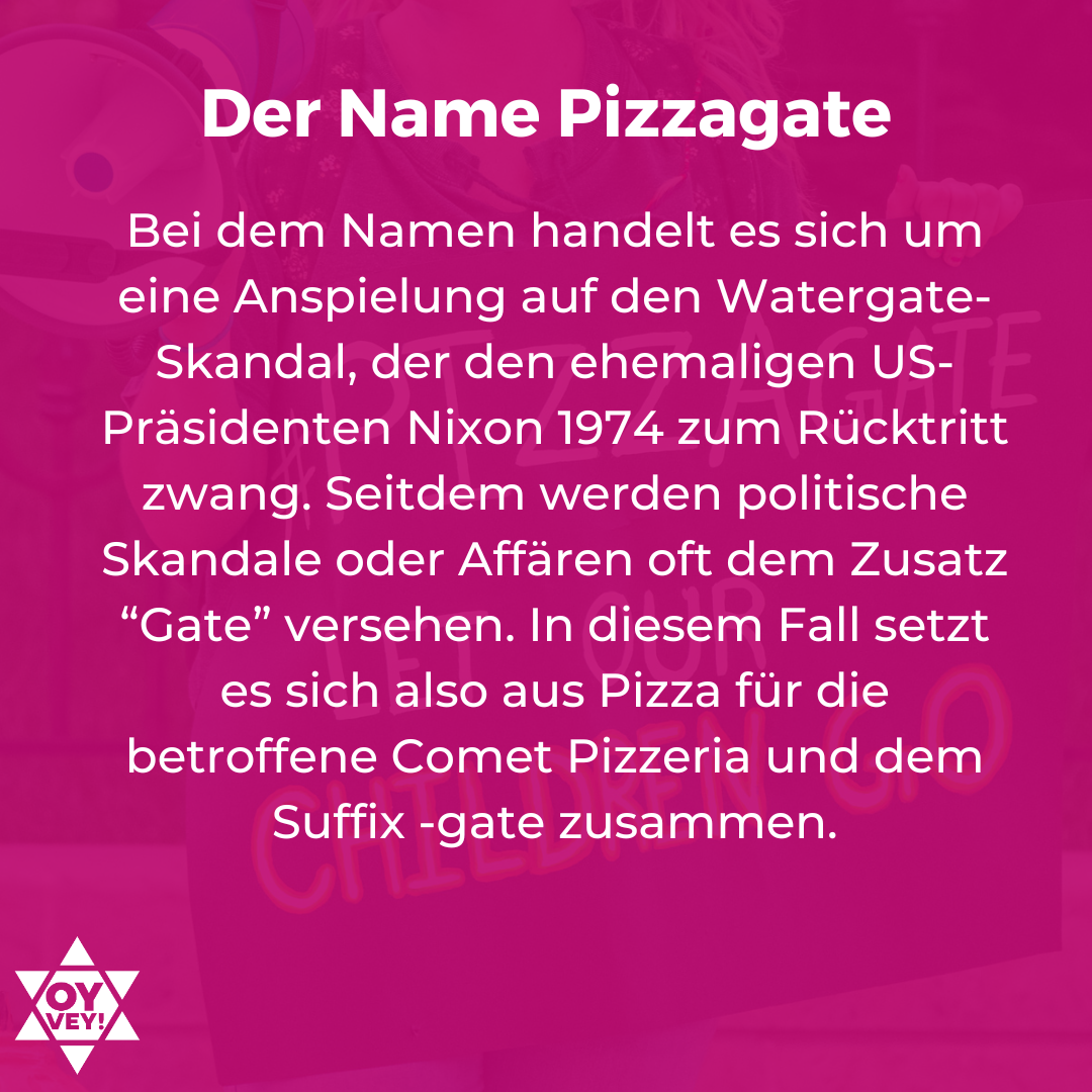Bei dem Namen Pizzagate handelt es übrigens sich um eine Anspielung auf den Watergate-Skandal, der den ehemaligen US-Präsidenten Nixon 1974 zum Rücktritt zwang. Seitdem werden politische Skandale oder Affären oft dem Zusatz “Gate” versehen. In diesem Fall setzt es sich also aus Pizza für die betroffene Comet Pizzeria und dem Suffix -gate zusammen.